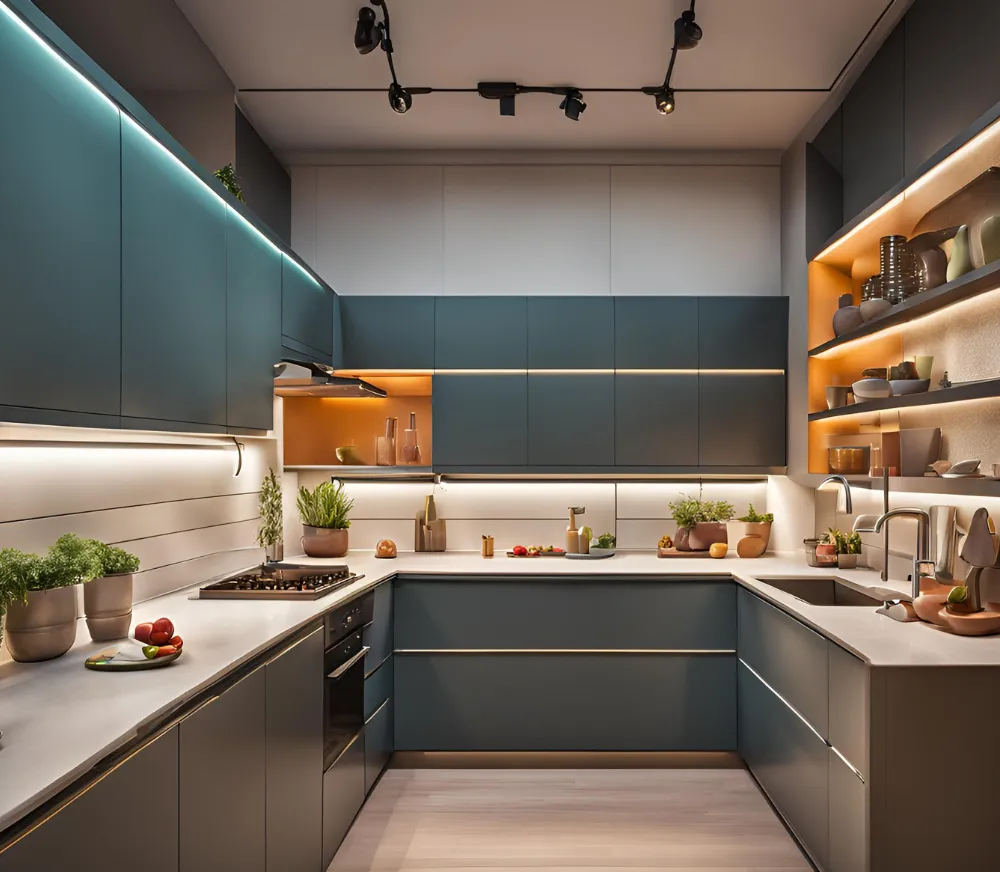 To enhance aesthetics, focus on cohesive colour schemes, quality finishes, and smart lighting. Open shelves, pendant lights, and decorative backsplashes can also add personality to the kitchen.