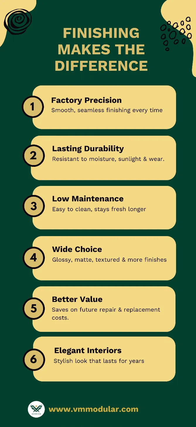 2. Are modular finishes harder to maintain? Not at all. In fact, they are easier to clean and maintain. Factory-applied finishes like laminates and acrylics are more resilient against stains and humidity, which is a major advantage in the Hyderabad climate.