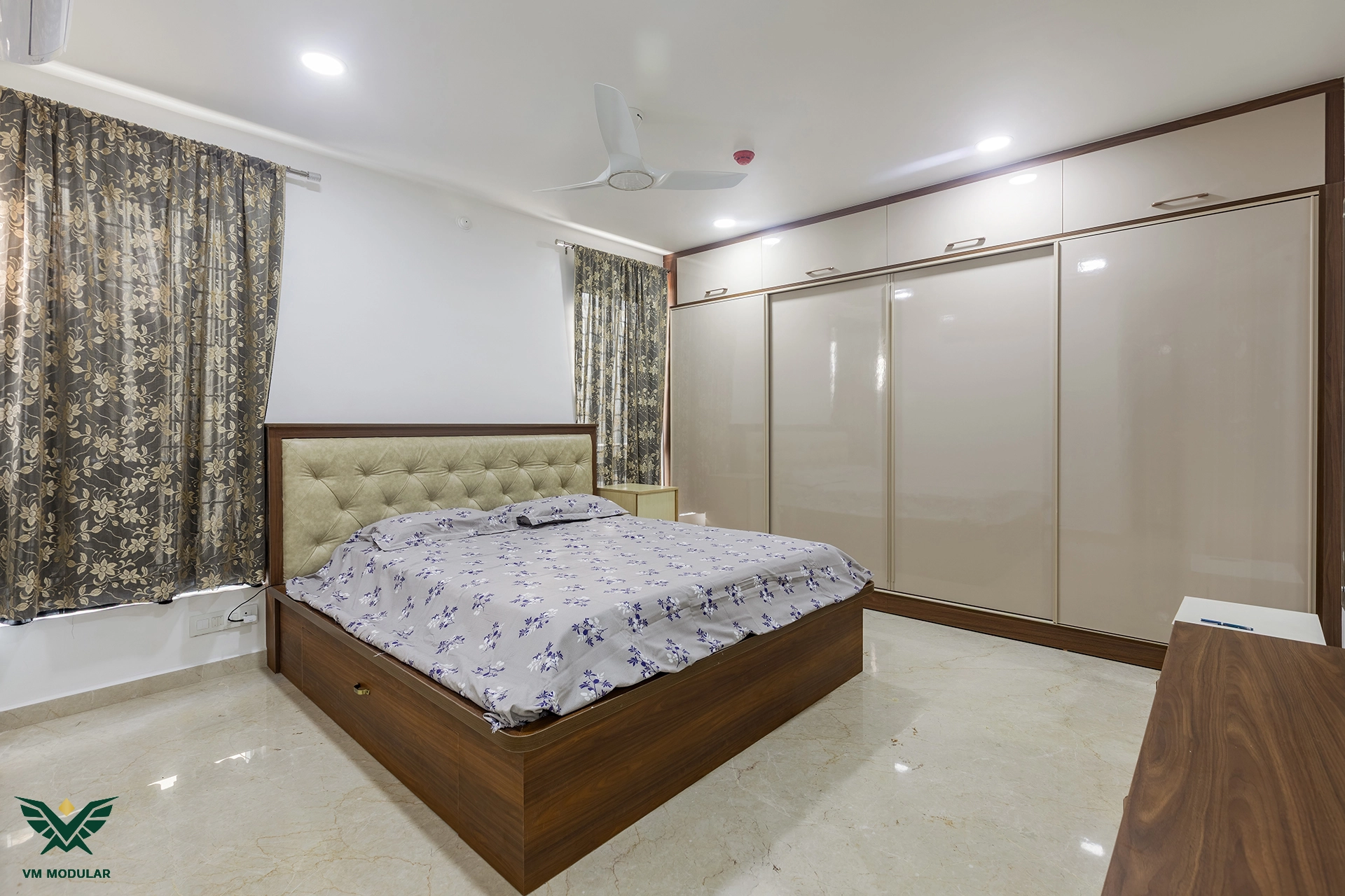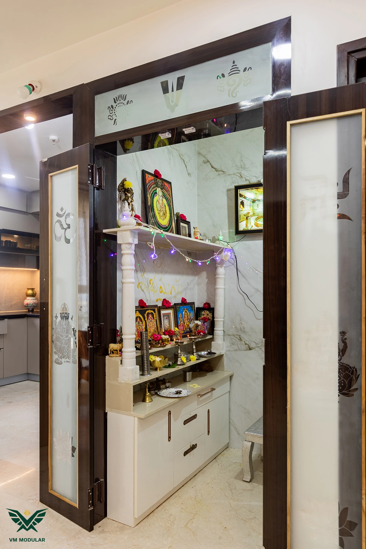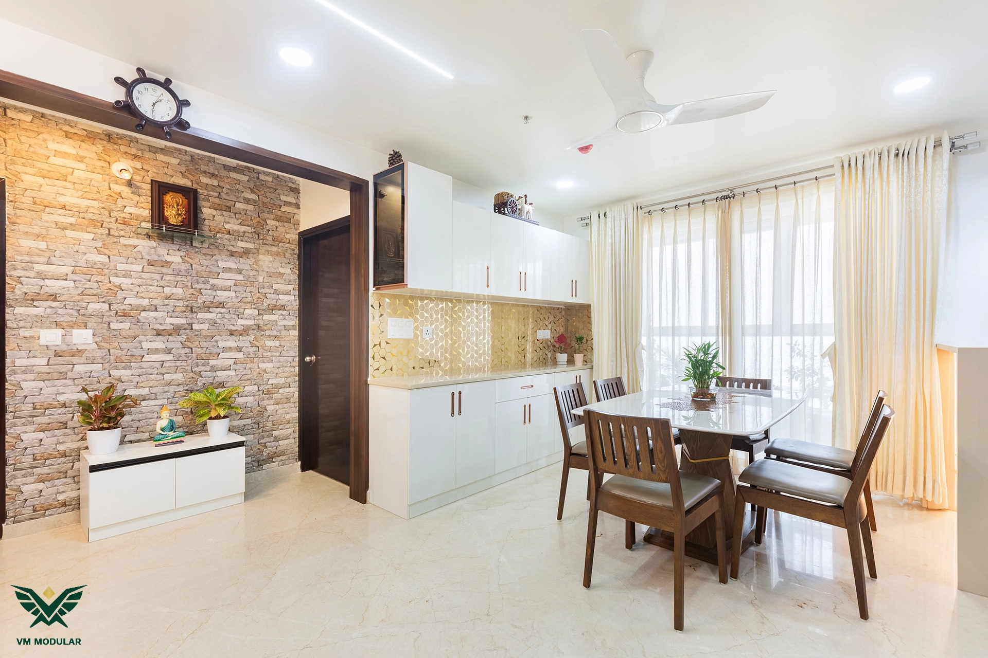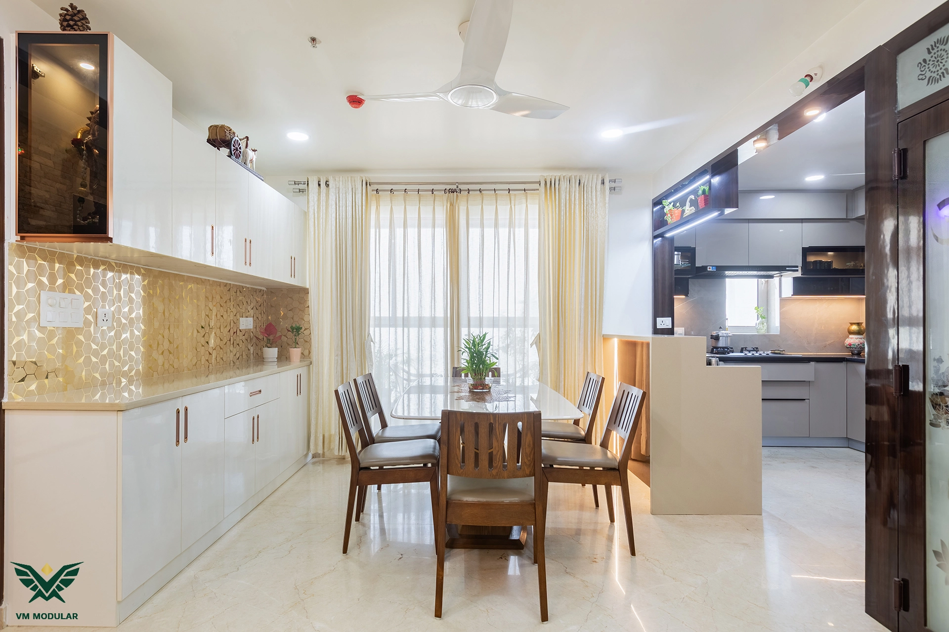 Perched on the top floor with an unobstructed, breathtaking view of Kamuni Cheruvu and its serene walking track, this lavish sky villa at Cybercity Marina Skies, Kukatpally, defines premium high-rise living. Spanning above 2800 sft, this west-facing apartment was designed to maximize the "Sky Villa" experience, where lavish balconies flood the home with an abundance of natural light. The design journey begins at the entrance, where we executed custom main door framing and a matching external shoe rack, setting a sophisticated tone before even stepping inside. The heart of the home is the expansive living area, featuring a huge, custom-designed TV unit integrated with warm cabinetry lighting. Understanding the client's spiritual requirements, we seamlessly incorporated a dedicated, illuminated showcase for their Lord Krishna idols right beside the main entertainment unit. To ensure the best return on investment (ROI) without compromising the luxury aesthetic, we utilized high-quality laminate finishes throughout the home, proving that durability and "lavish" design go hand-in-hand. The private quarters are a masterclass in modern modular interiors. Both master bedrooms feature sleek, space-saving sliding wardrobes and dedicated bedroom TV units. For the work-from-home needs, we designed two distinct study units, including a standout innovative rotating table in one of the rooms, to provide maximum flexibility. From the precision-engineered cabinetry to the thoughtful layout that ensures no other tower interferes with the lakeside view, this project stands as a premier example of modern interior design in Hyderabad.