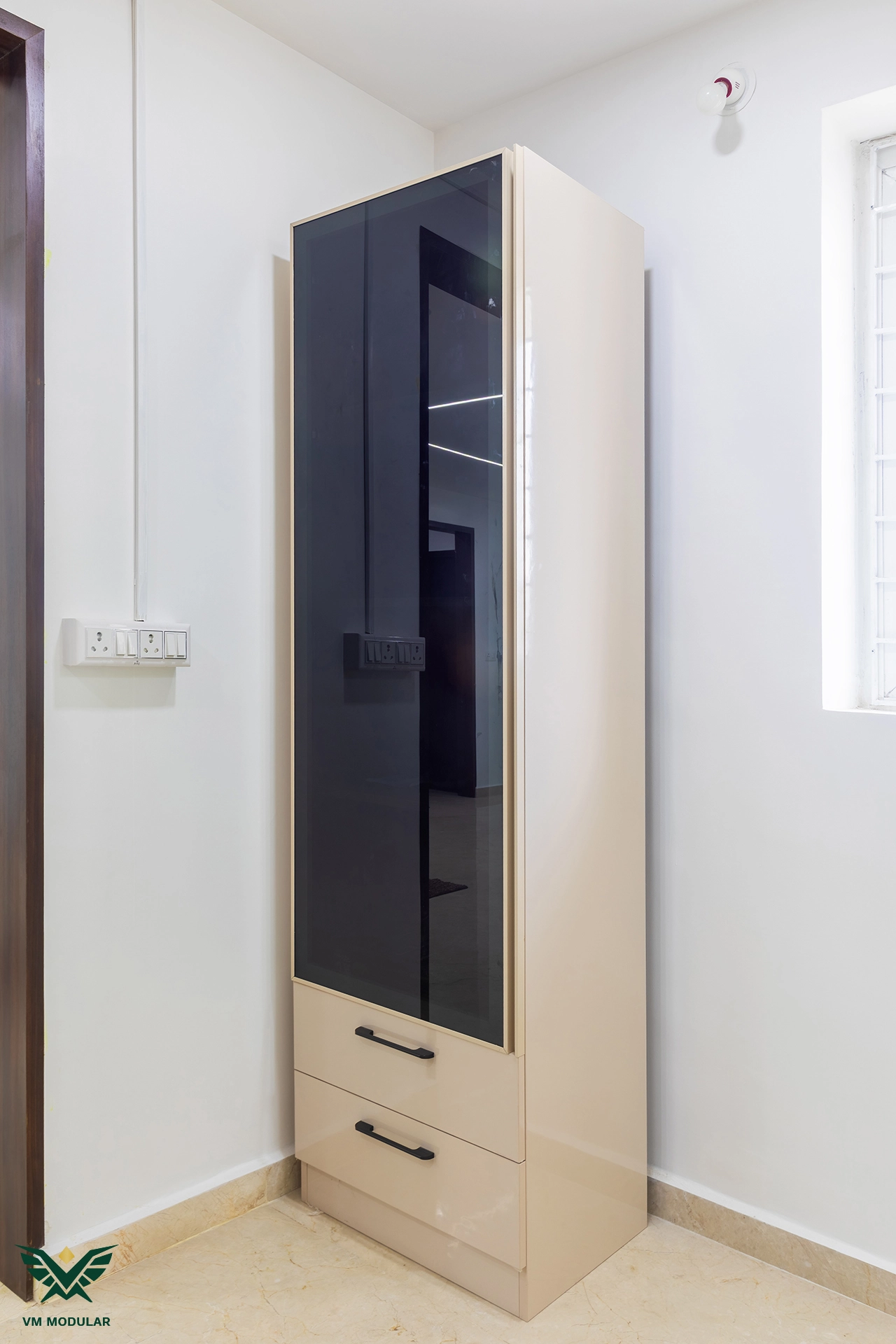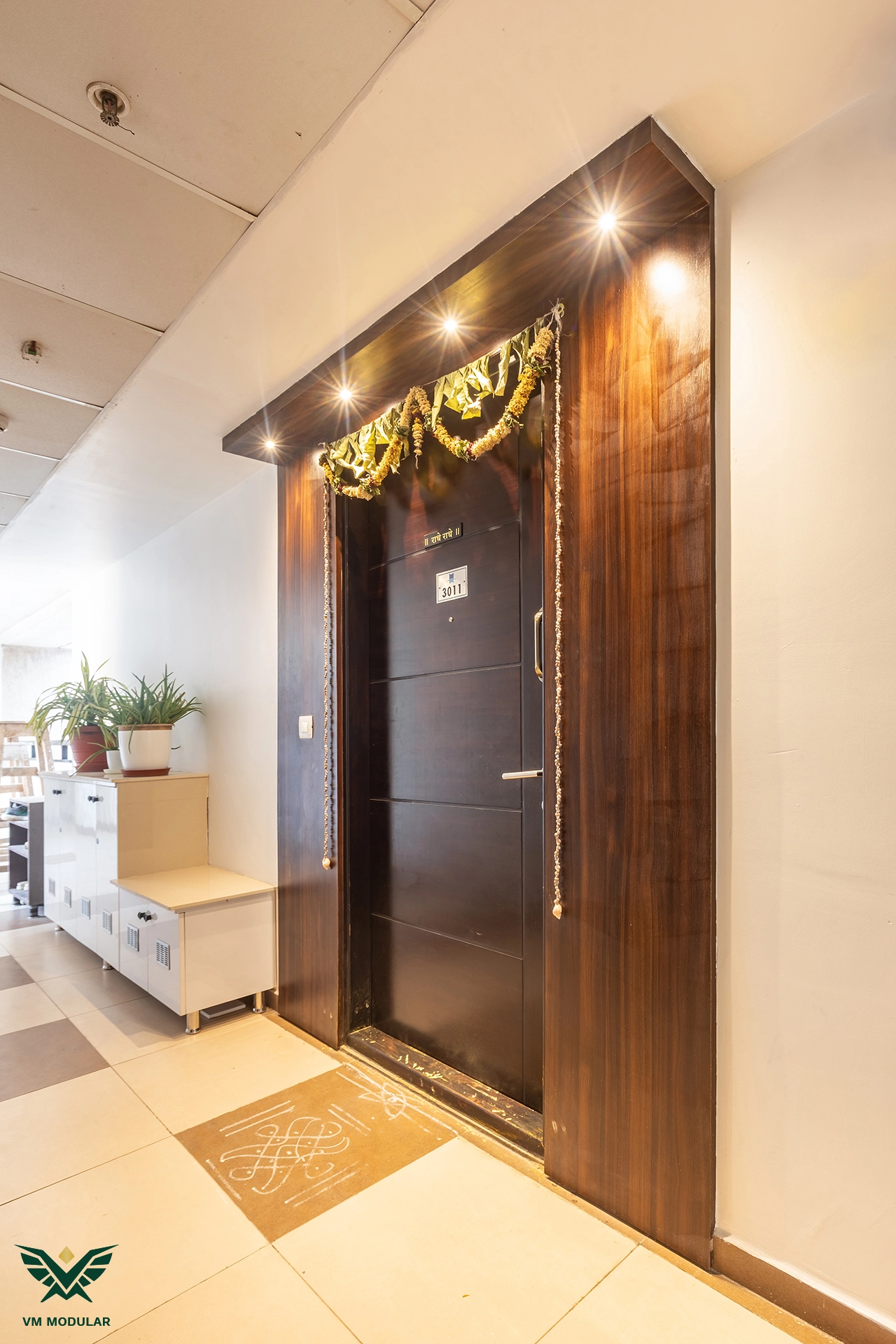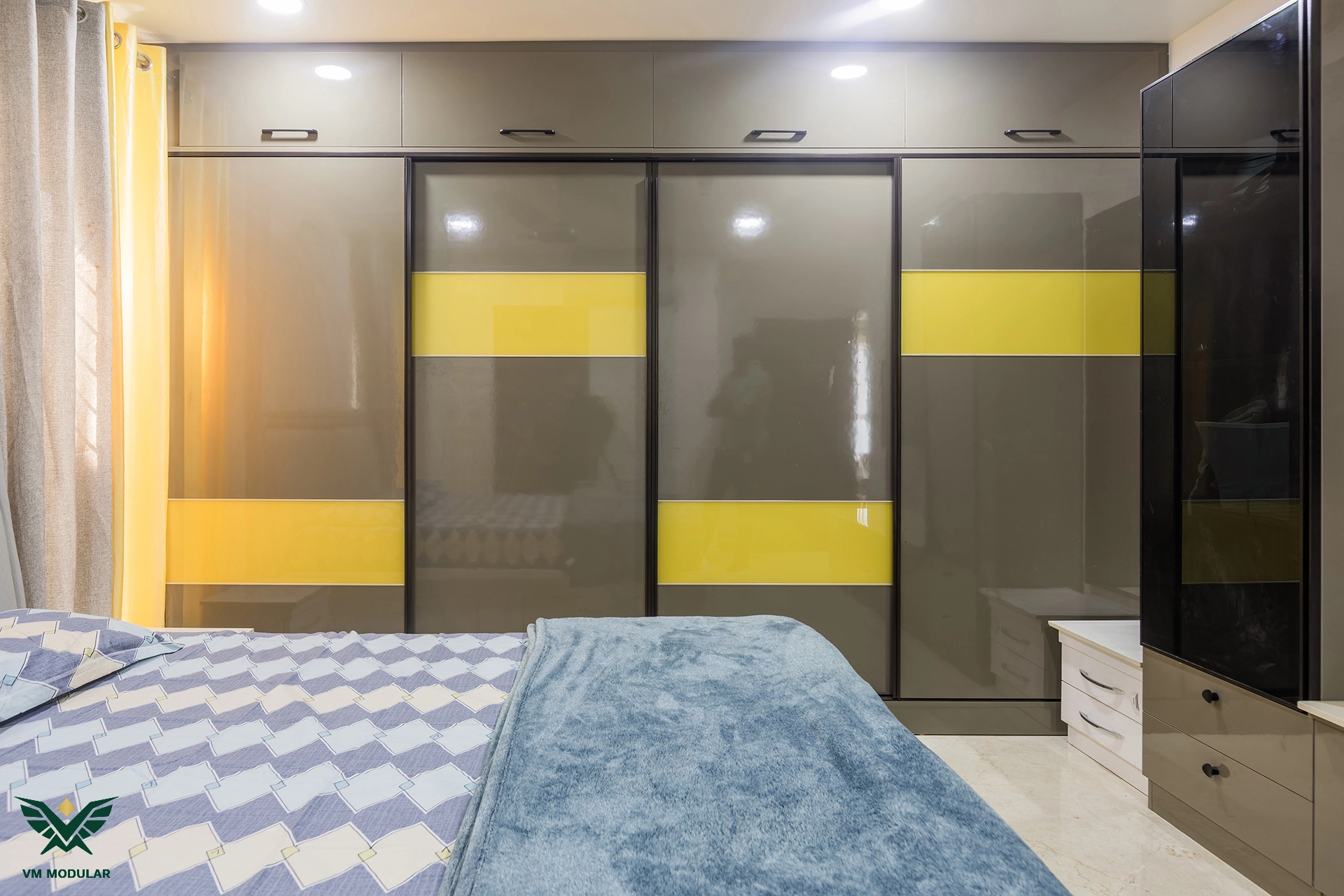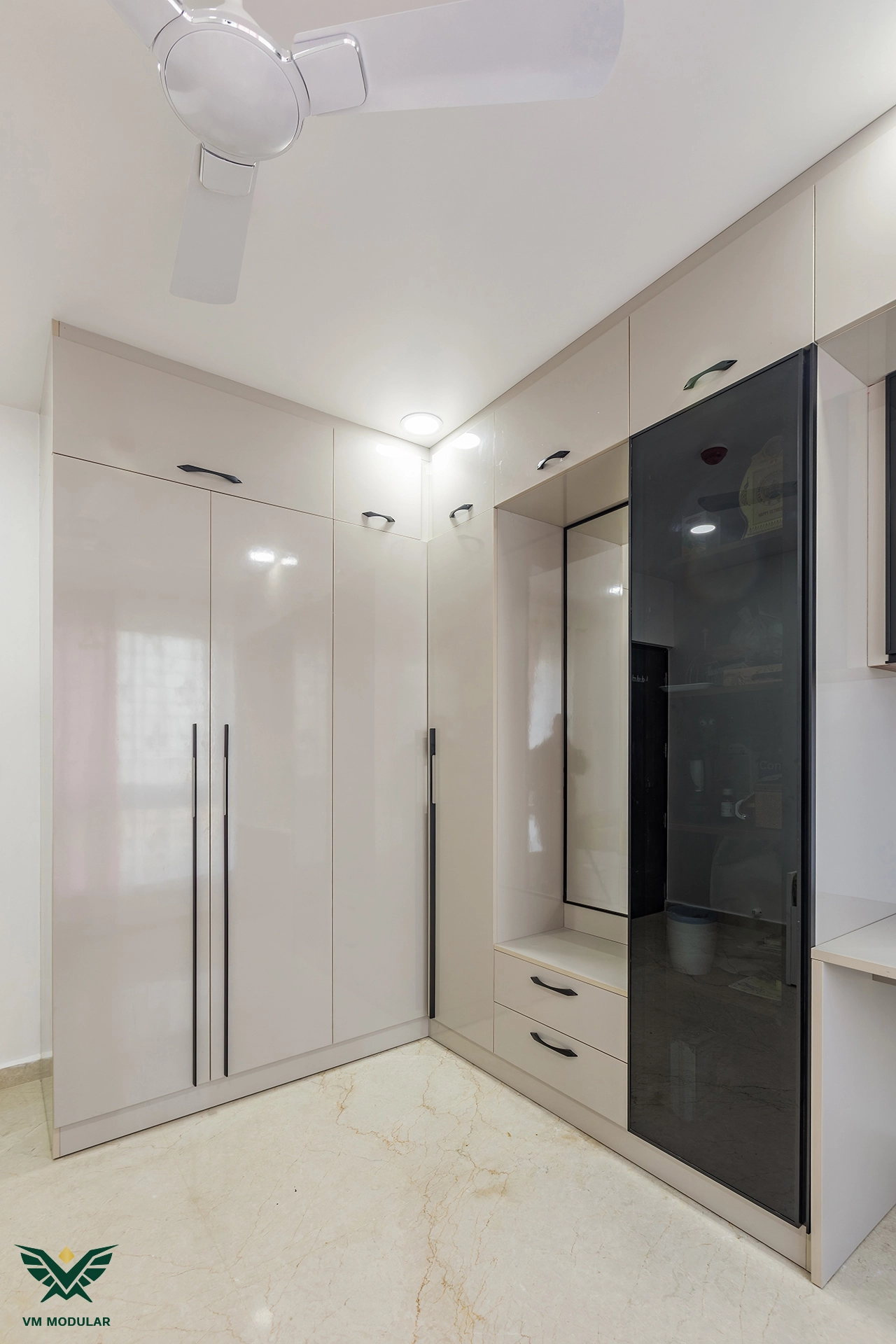 Perched on the top floor with an unobstructed, breathtaking view of Kamuni Cheruvu and its serene walking track, this lavish sky villa at Cybercity Marina Skies, Kukatpally, defines premium high-rise living. Spanning above 2800 sft, this west-facing apartment was designed to maximize the "Sky Villa" experience, where lavish balconies flood the home with an abundance of natural light. The design journey begins at the entrance, where we executed custom main door framing and a matching external shoe rack, setting a sophisticated tone before even stepping inside. The heart of the home is the expansive living area, featuring a huge, custom-designed TV unit integrated with warm cabinetry lighting. Understanding the client's spiritual requirements, we seamlessly incorporated a dedicated, illuminated showcase for their Lord Krishna idols right beside the main entertainment unit. To ensure the best return on investment (ROI) without compromising the luxury aesthetic, we utilized high-quality laminate finishes throughout the home, proving that durability and "lavish" design go hand-in-hand. The private quarters are a masterclass in modern modular interiors. Both master bedrooms feature sleek, space-saving sliding wardrobes and dedicated bedroom TV units. For the work-from-home needs, we designed two distinct study units, including a standout innovative rotating table in one of the rooms, to provide maximum flexibility. From the precision-engineered cabinetry to the thoughtful layout that ensures no other tower interferes with the lakeside view, this project stands as a premier example of modern interior design in Hyderabad.