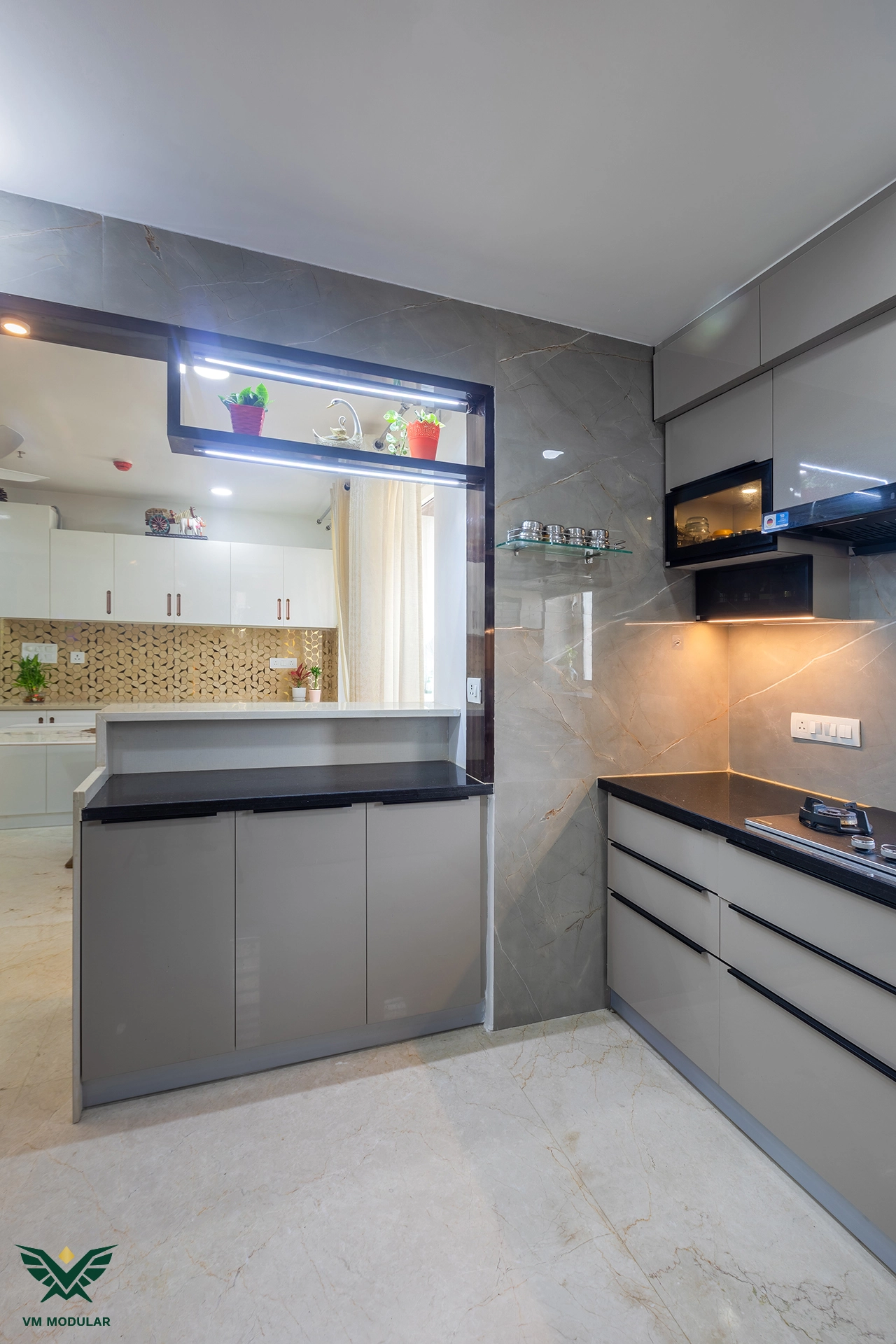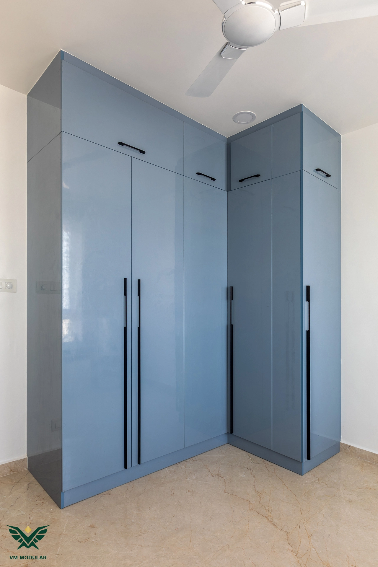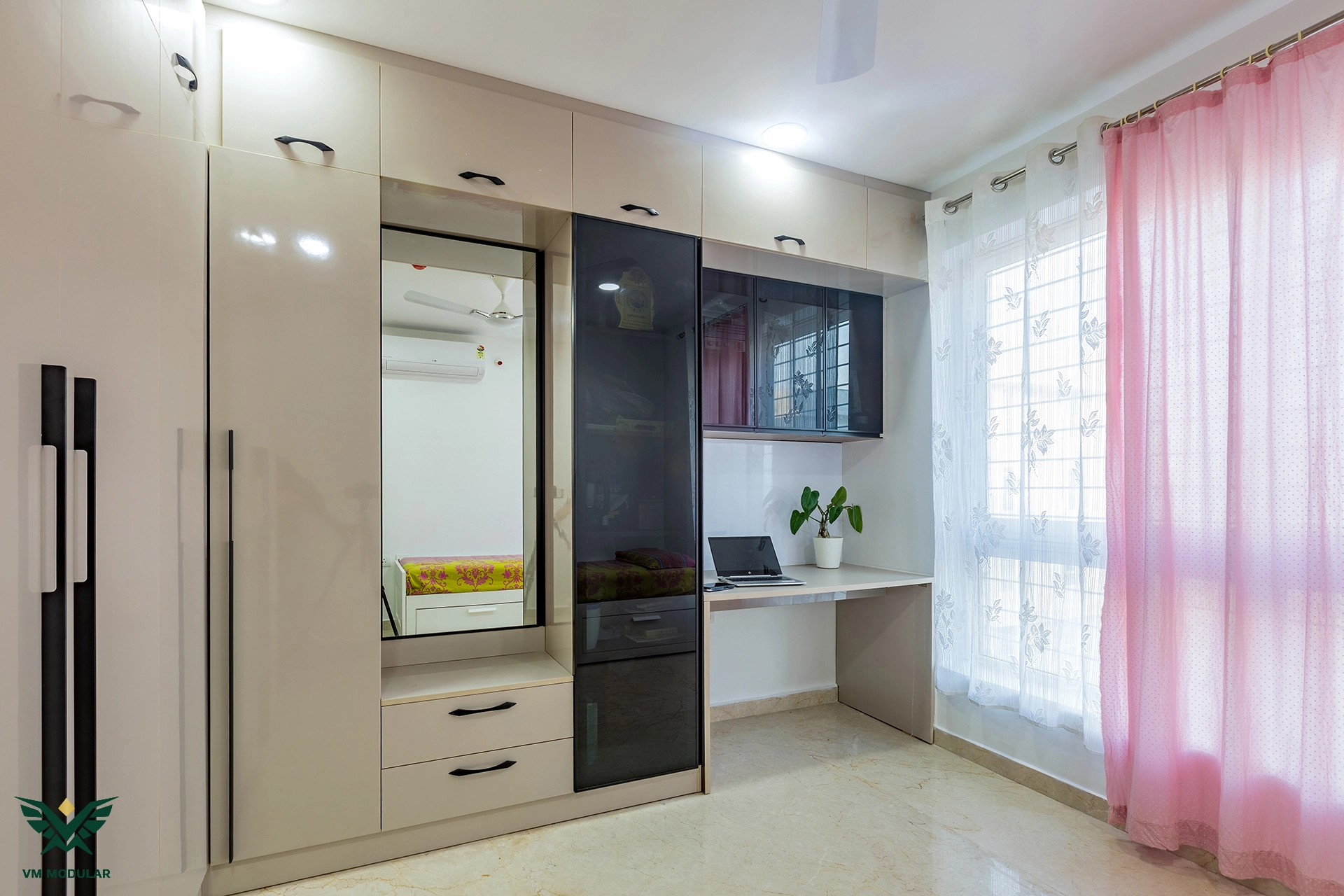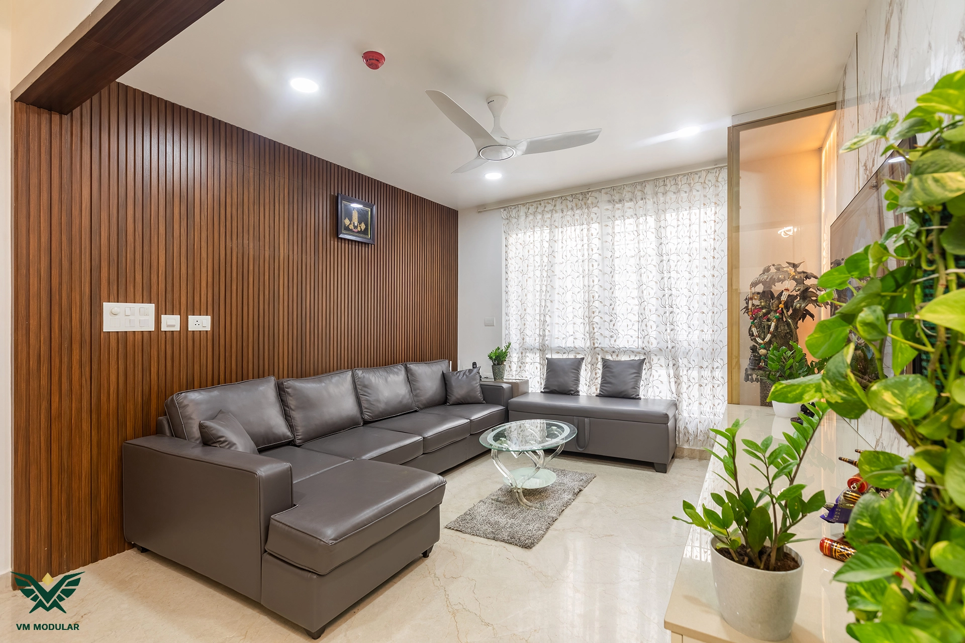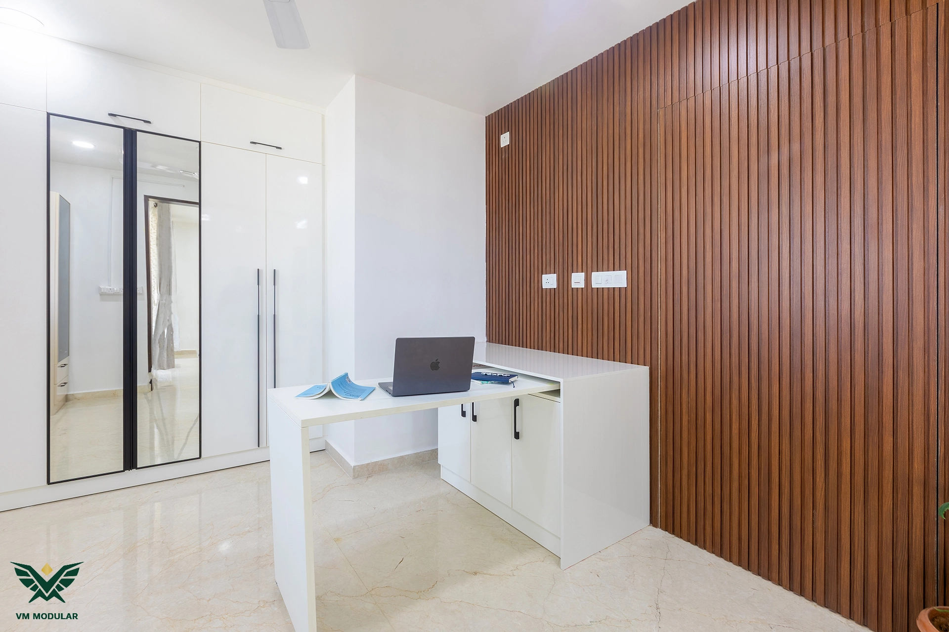 Perched on the top floor with an unobstructed, breathtaking view of Kamuni Cheruvu and its serene walking track, this lavish sky villa at Cybercity Marina Skies, Kukatpally, defines premium high-rise living. Spanning above 2800 sft, this west-facing apartment was designed to maximize the "Sky Villa" experience, where lavish balconies flood the home with an abundance of natural light. The design journey begins at the entrance, where we executed custom main door framing and a matching external shoe rack, setting a sophisticated tone before even stepping inside. The heart of the home is the expansive living area, featuring a huge, custom-designed TV unit integrated with warm cabinetry lighting. Understanding the client's spiritual requirements, we seamlessly incorporated a dedicated, illuminated showcase for their Lord Krishna idols right beside the main entertainment unit. To ensure the best return on investment (ROI) without compromising the luxury aesthetic, we utilized high-quality laminate finishes throughout the home, proving that durability and "lavish" design go hand-in-hand. The private quarters are a masterclass in modern modular interiors. Both master bedrooms feature sleek, space-saving sliding wardrobes and dedicated bedroom TV units. For the work-from-home needs, we designed two distinct study units, including a standout innovative rotating table in one of the rooms, to provide maximum flexibility. From the precision-engineered cabinetry to the thoughtful layout that ensures no other tower interferes with the lakeside view, this project stands as a premier example of modern interior design in Hyderabad.
