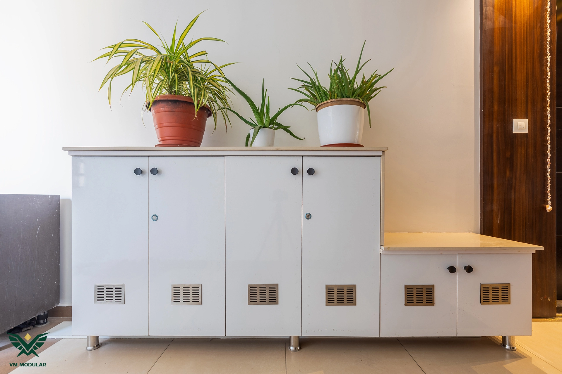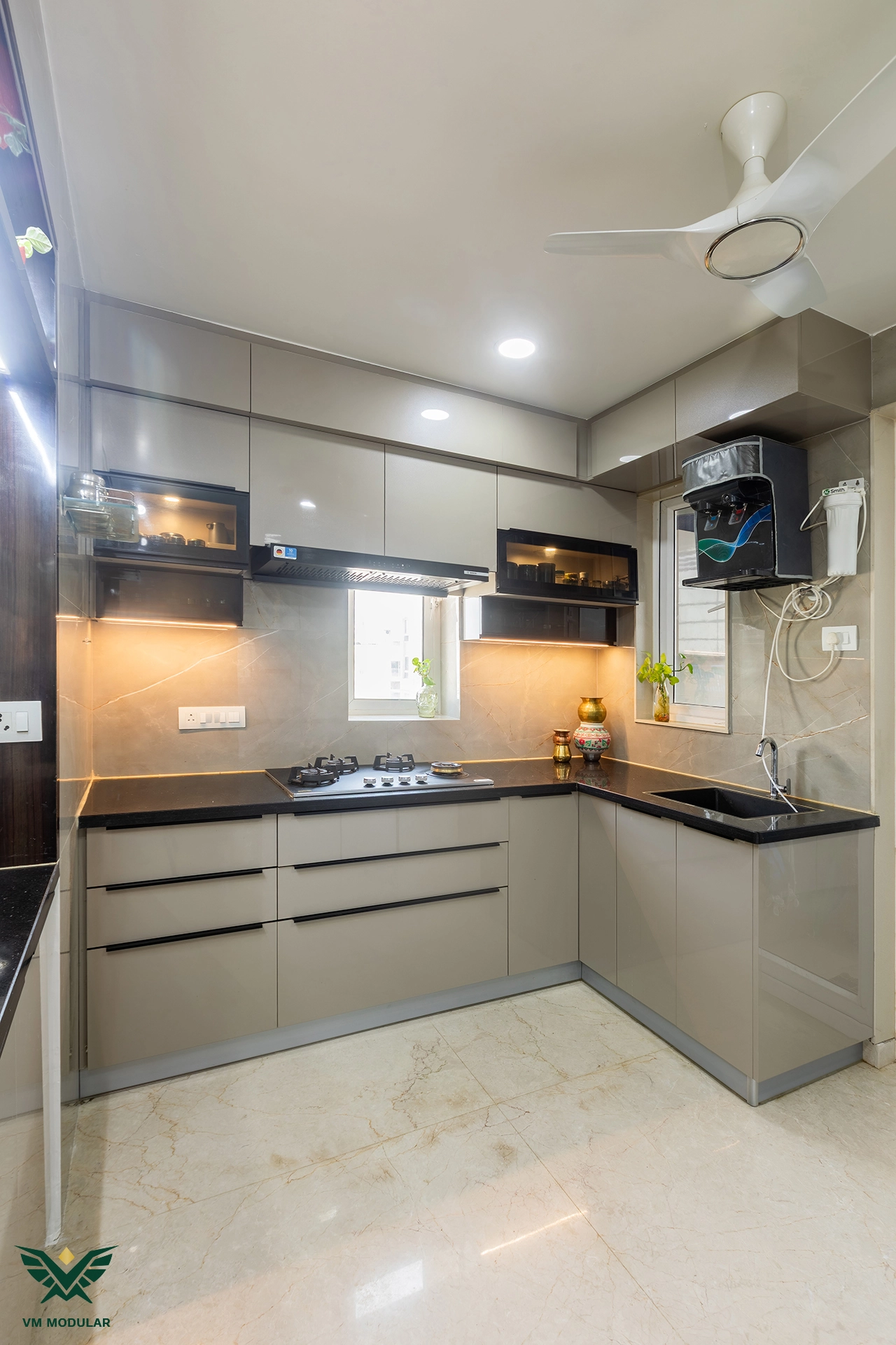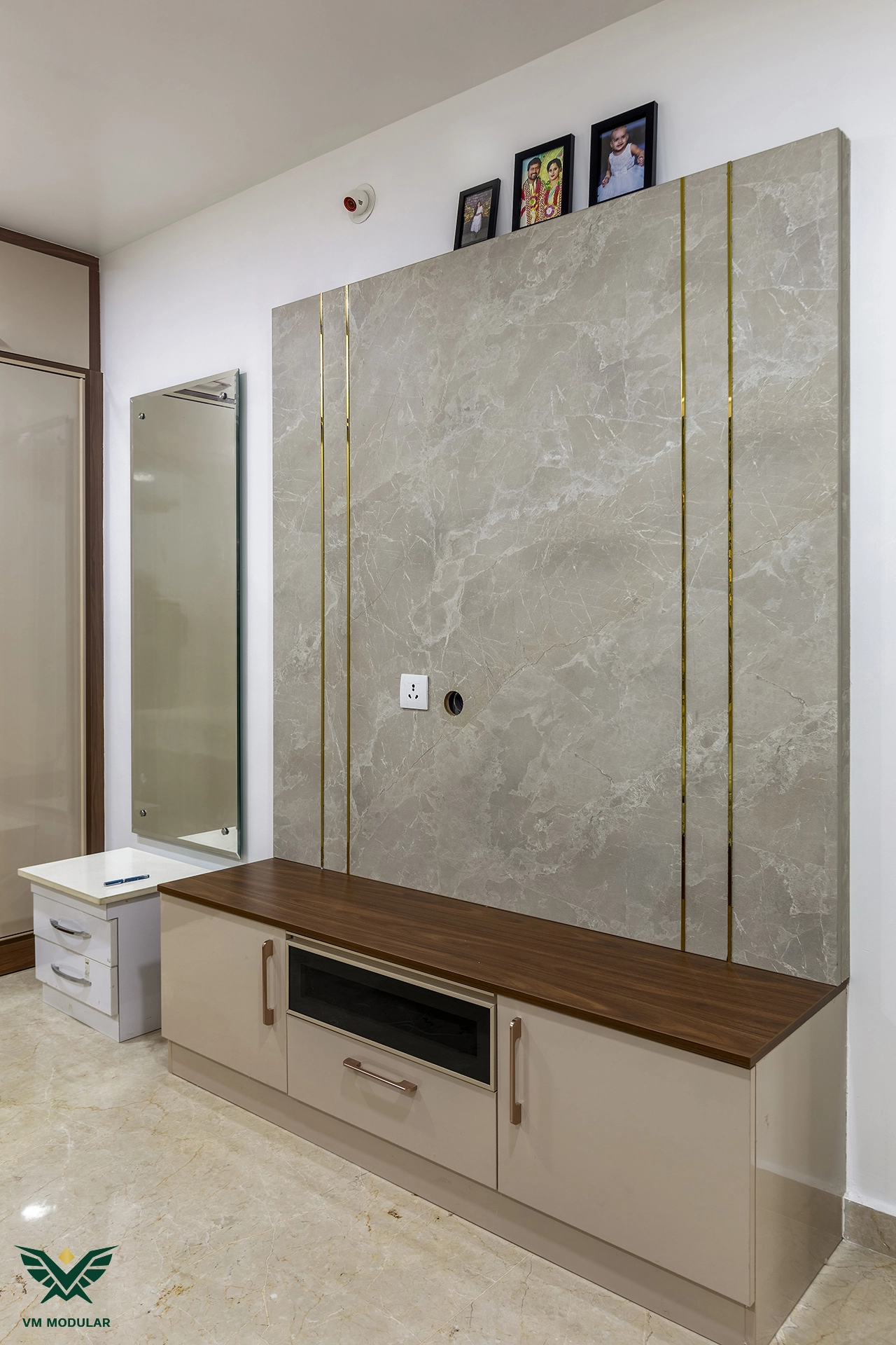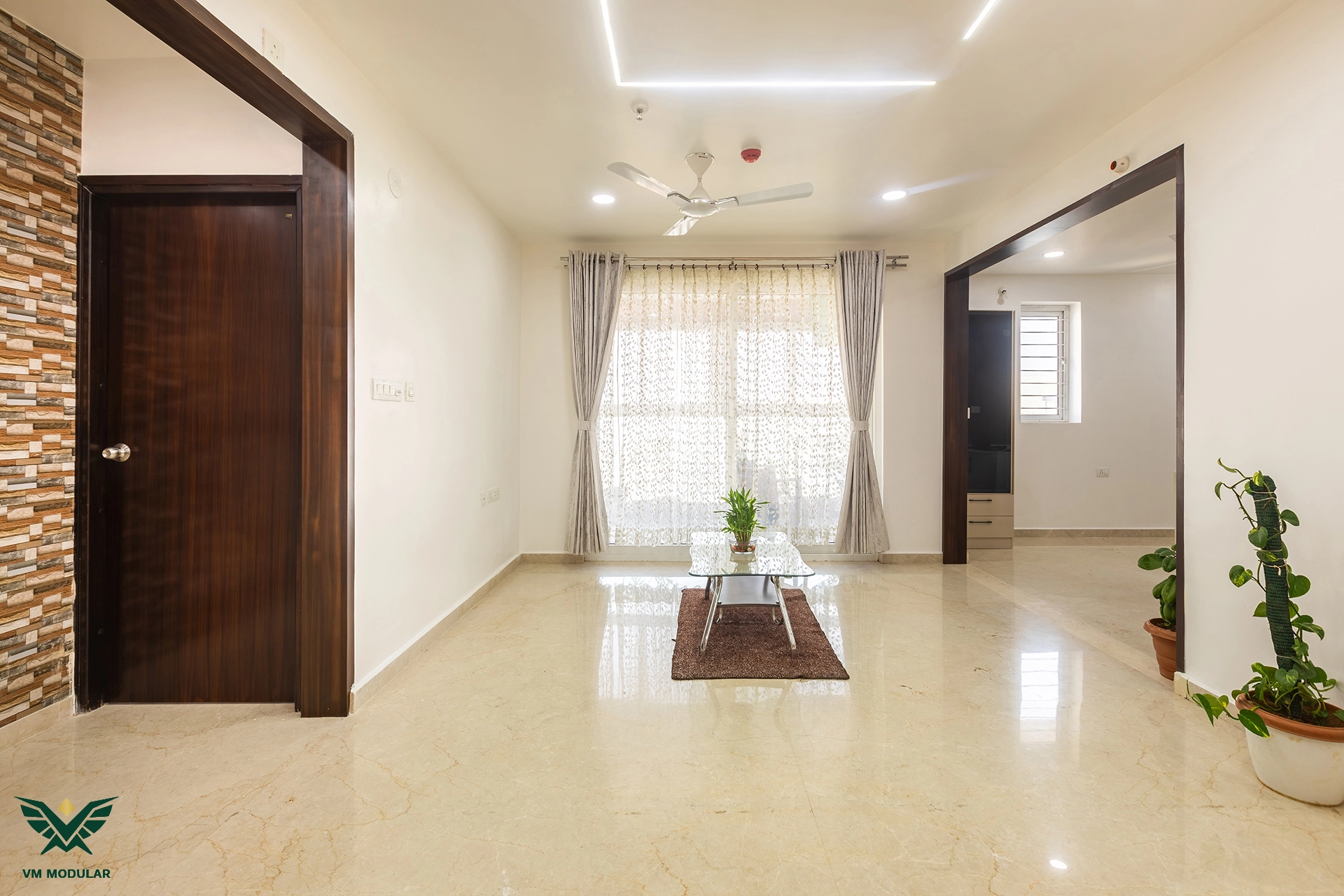 Perched on the top floor with an unobstructed, breathtaking view of Kamuni Cheruvu and its serene walking track, this lavish sky villa at Cybercity Marina Skies, Kukatpally, defines premium high-rise living. Spanning above 2800 sft, this west-facing apartment was designed to maximize the "Sky Villa" experience, where lavish balconies flood the home with an abundance of natural light. The design journey begins at the entrance, where we executed custom main door framing and a matching external shoe rack, setting a sophisticated tone before even stepping inside. The heart of the home is the expansive living area, featuring a huge, custom-designed TV unit integrated with warm cabinetry lighting. Understanding the client's spiritual requirements, we seamlessly incorporated a dedicated, illuminated showcase for their Lord Krishna idols right beside the main entertainment unit. To ensure the best return on investment (ROI) without compromising the luxury aesthetic, we utilized high-quality laminate finishes throughout the home, proving that durability and "lavish" design go hand-in-hand. The private quarters are a masterclass in modern modular interiors. Both master bedrooms feature sleek, space-saving sliding wardrobes and dedicated bedroom TV units. For the work-from-home needs, we designed two distinct study units, including a standout innovative rotating table in one of the rooms, to provide maximum flexibility. From the precision-engineered cabinetry to the thoughtful layout that ensures no other tower interferes with the lakeside view, this project stands as a premier example of modern interior design in Hyderabad.
