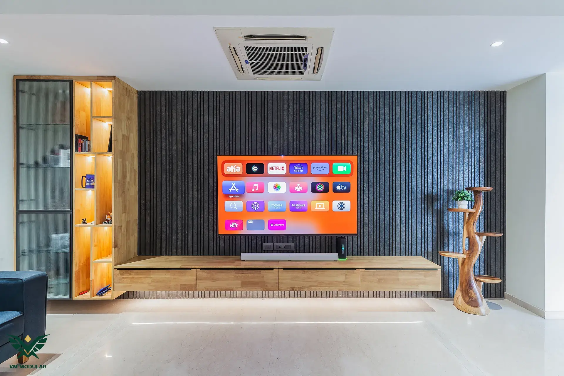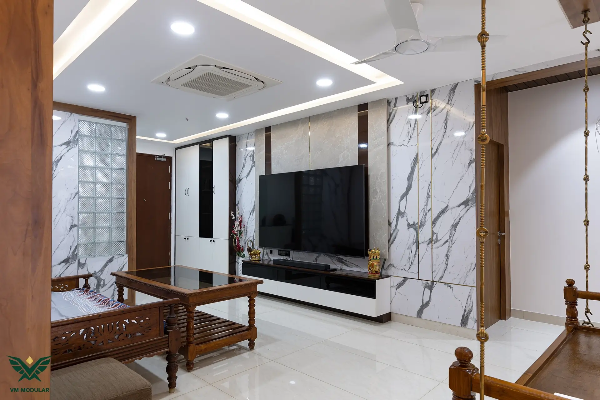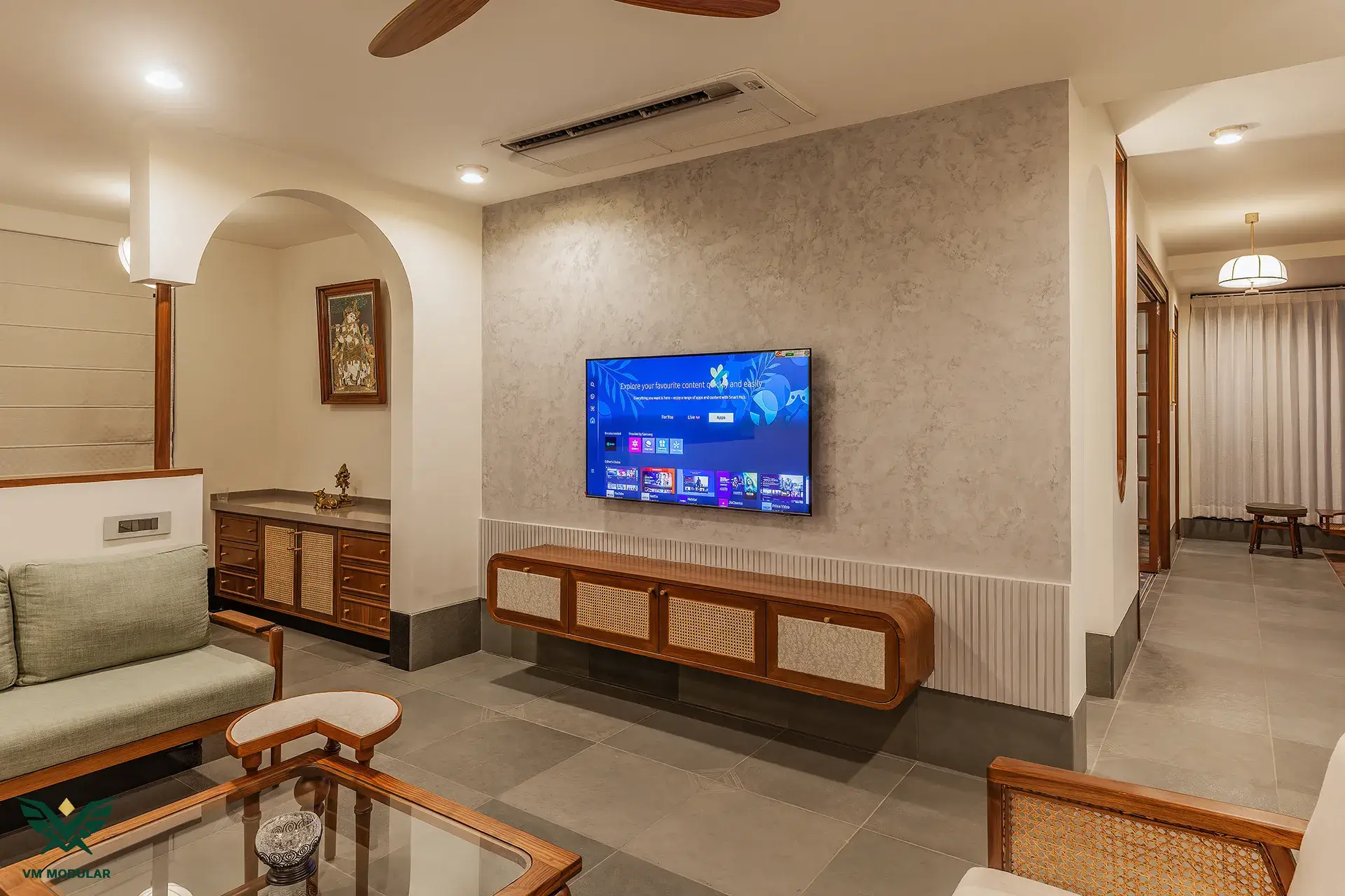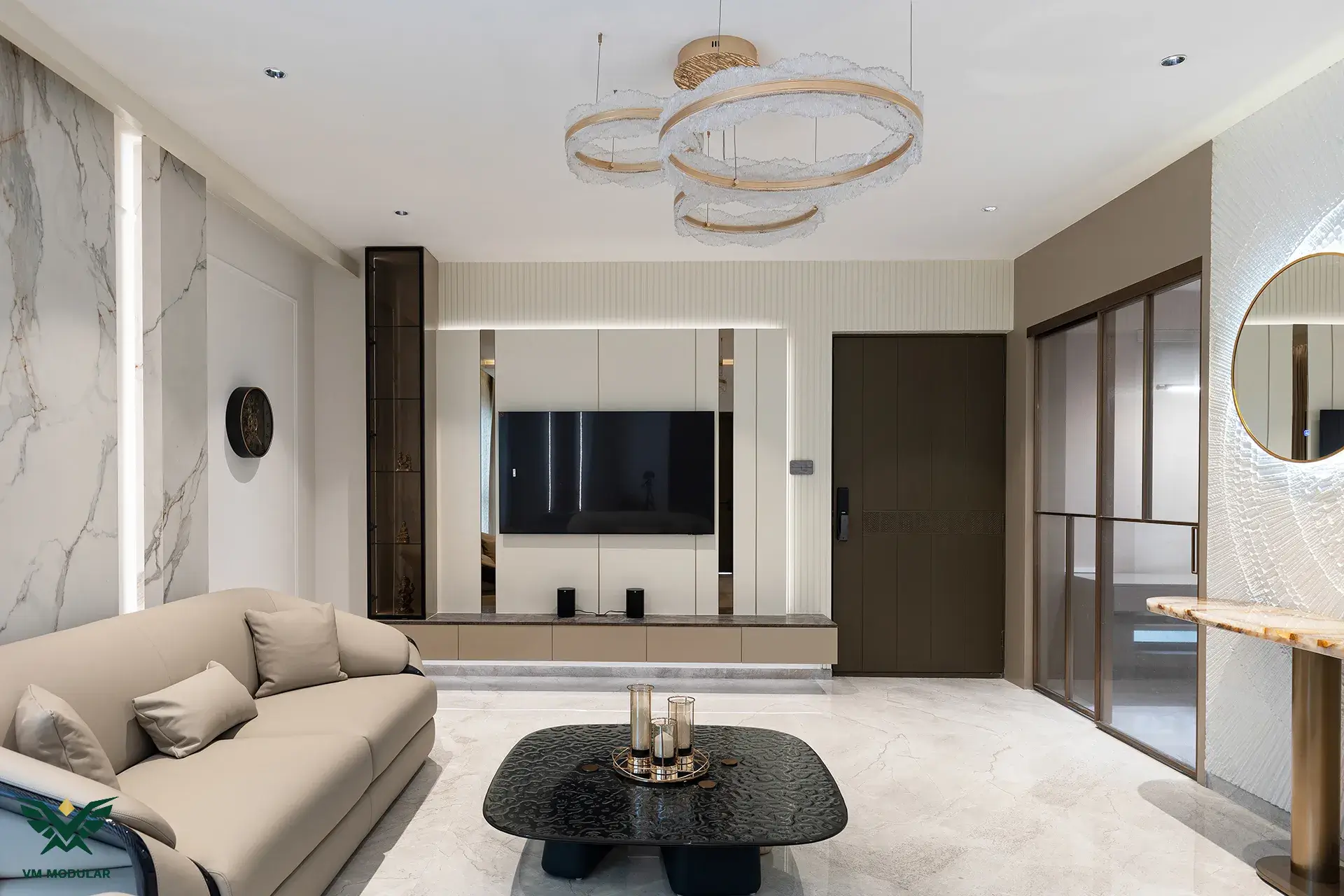 In this chic interior, a palette of white and beige furnishings sets the tone for a modern and sophisticated ambiance. A carefully placed pop of color adds a touch of vibrancy, infusing the space with a classy and contemporary allure, creating a stylish balance of simplicity and flair.