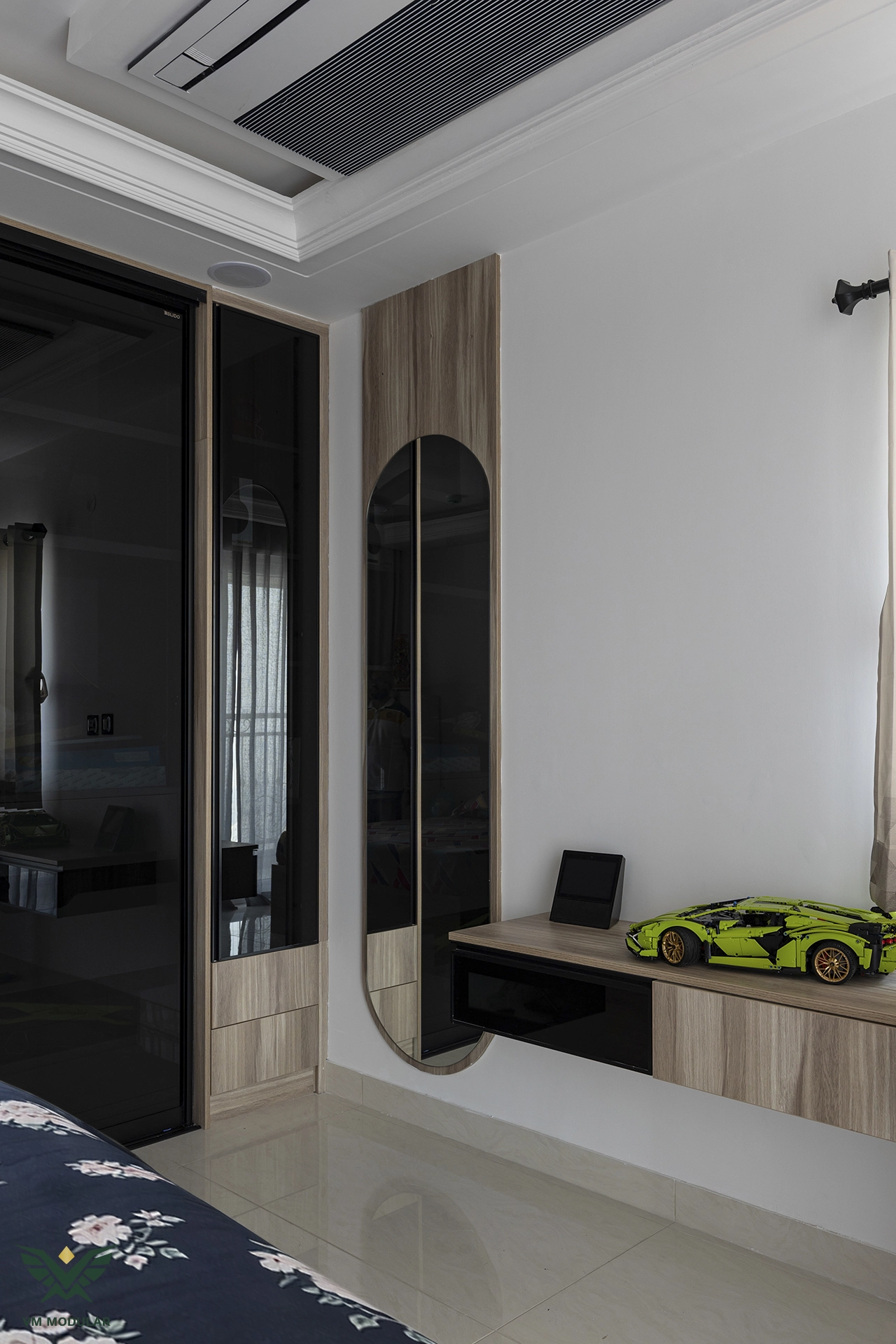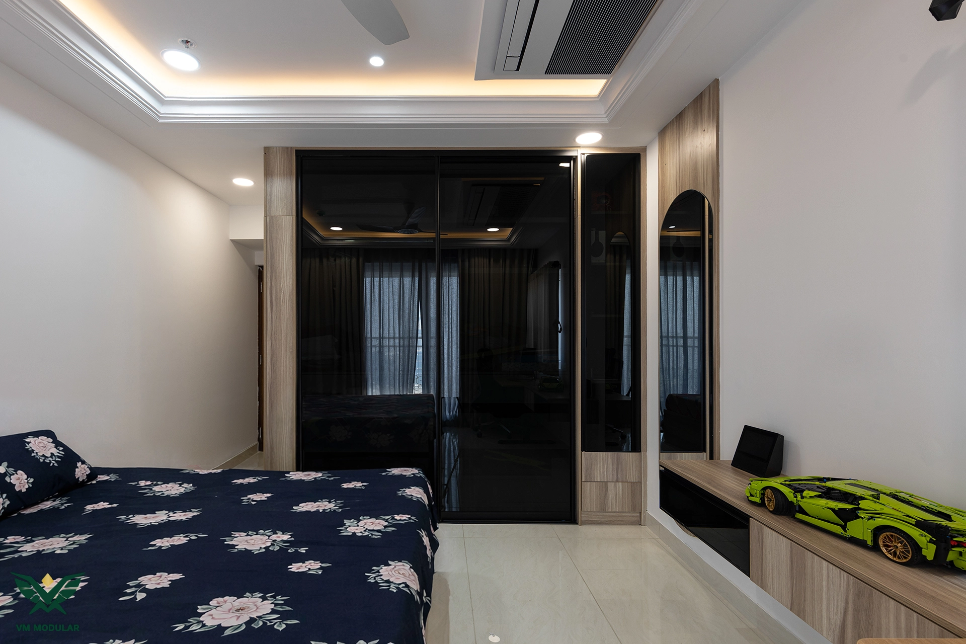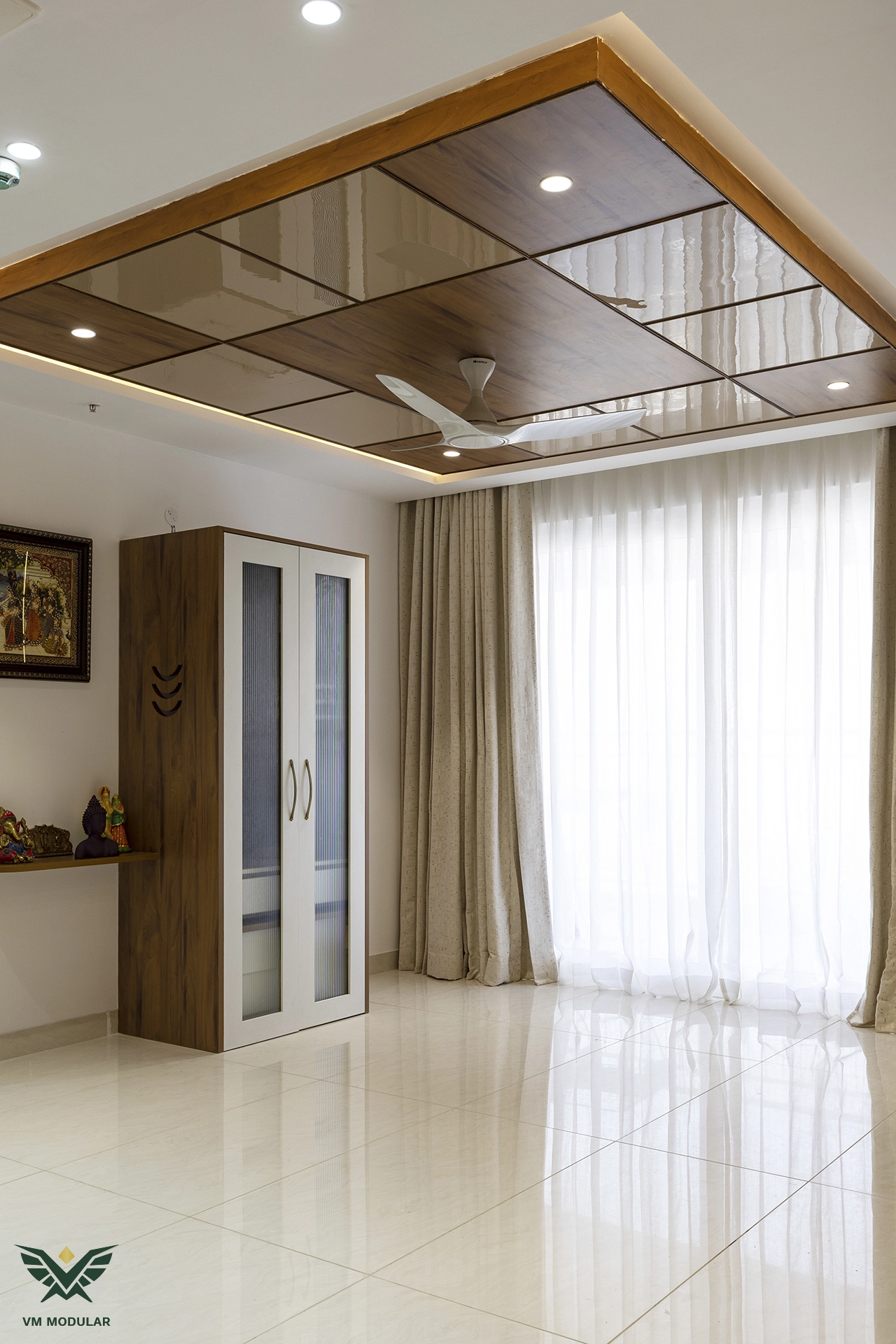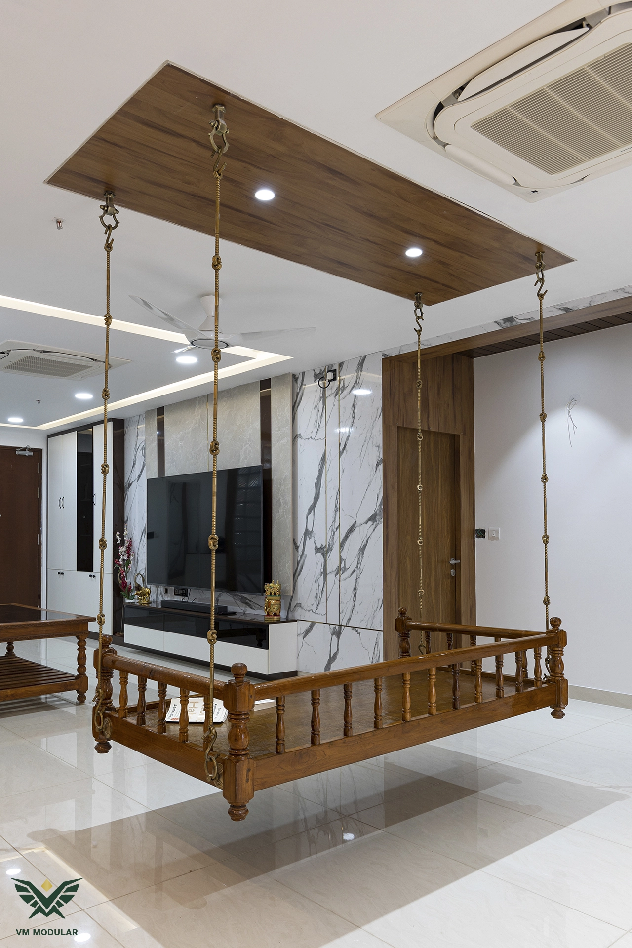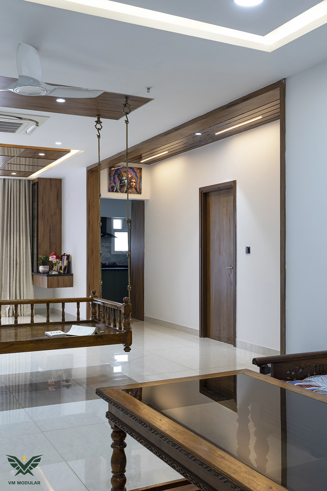 Located in the luxury corridor of Kokapet, this expansive 4BHK interior design project at Prestige Beverly Hills is a testament to how modern aesthetics can gracefully embrace tradition. The design narrative centers on a seamless fusion: while the home is distinctly modern, the living area serves as a cultural anchor, where we meticulously integrated the client’s heritage solid wood swing into the layout, creating a nostalgic yet cohesive focal point. Addressing the floor plan’s constraints, we also designed a custom Pooja unit within the living space and dedicated a special wall to honor the client's parents' photo, ensuring the home remains deeply rooted in personal sentiment. Moving into the private zones, the design shifts to ultra-modern sophistication. In three of the bedrooms, we installed stunning floor-to-ceiling wardrobes with sleek glass shutters, creating a sense of openness and luxury. The guest bedroom creates a warm contrast with premium laminate-finish hinged wardrobes. Beyond storage, VM Modular executed a complete furnishing solution, crafting custom beds with upholstered headboards, ergonomic study units, and dedicated book storage for every room. Each bedroom also features a thoughtfully designed dresser unit, ensuring maximum functionality. From the entertainment-ready TV unit in the living room to the heavy-duty modular kitchen, every module is powered by world-class Blum hardware, promising a lifetime of smooth operation. This project stands as a prime example of premium residential interiors in Hyderabad, where personalized design meets factory-precision engineering.