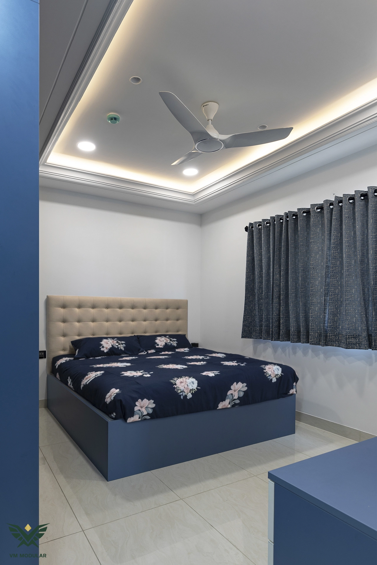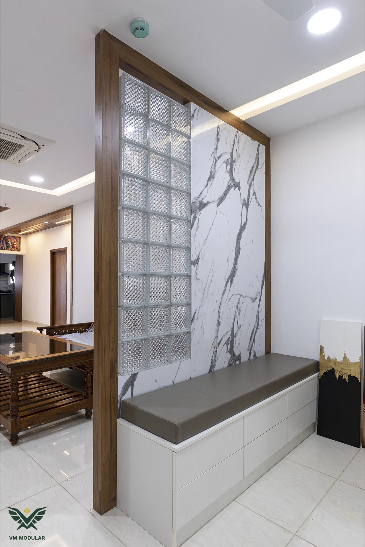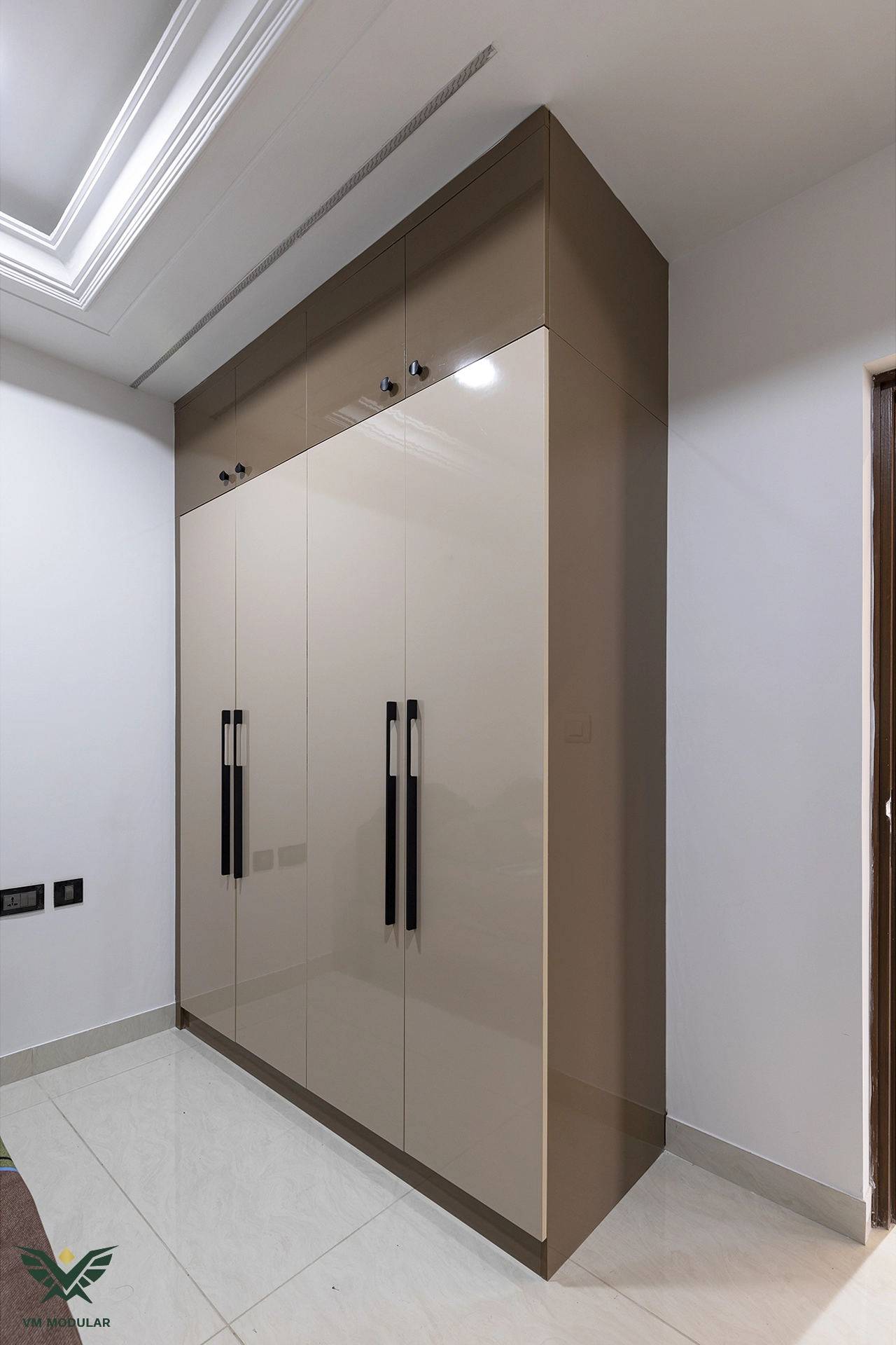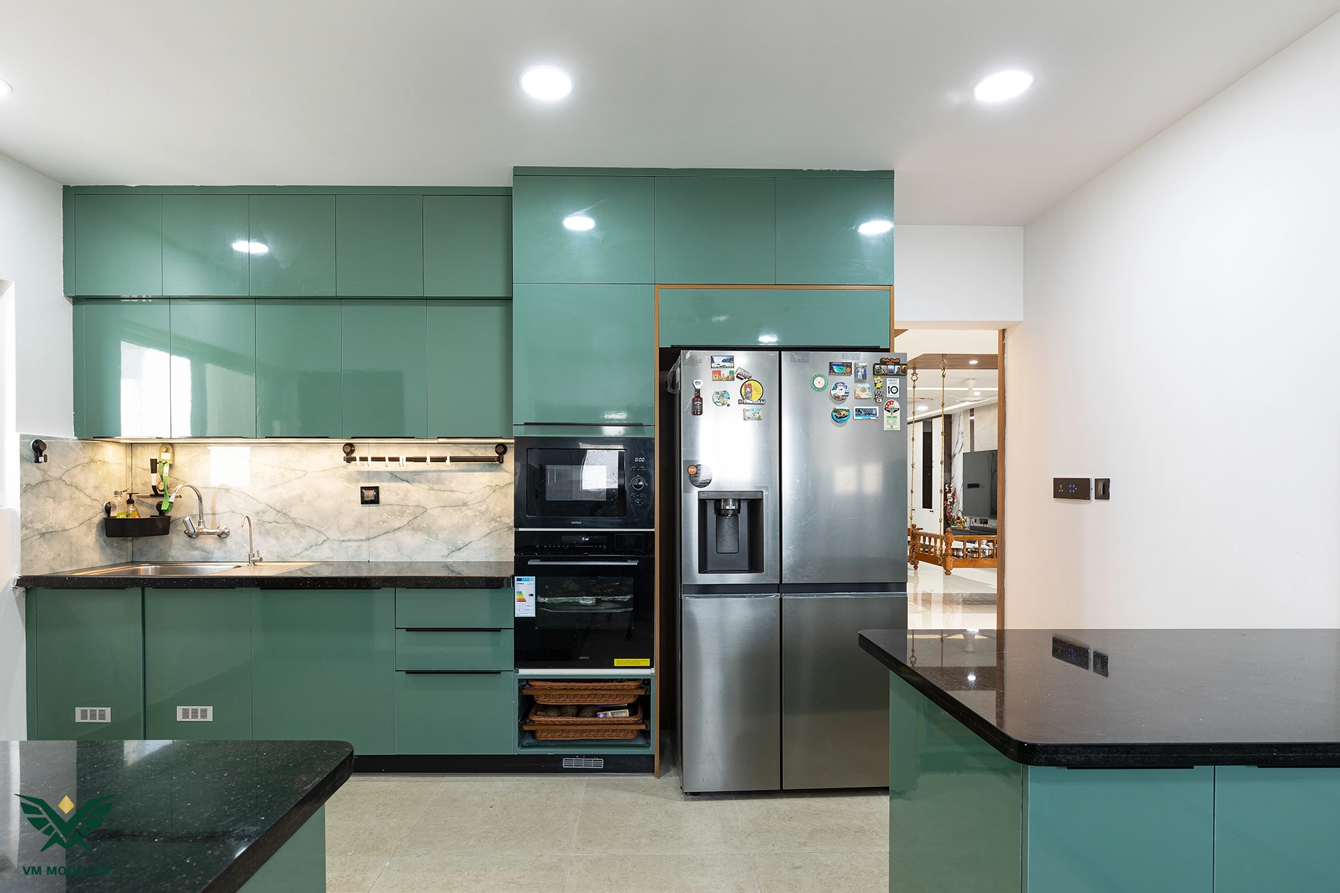 Located in the luxury corridor of Kokapet, this expansive 4BHK interior design project at Prestige Beverly Hills is a testament to how modern aesthetics can gracefully embrace tradition. The design narrative centers on a seamless fusion: while the home is distinctly modern, the living area serves as a cultural anchor, where we meticulously integrated the client’s heritage solid wood swing into the layout, creating a nostalgic yet cohesive focal point. Addressing the floor plan’s constraints, we also designed a custom Pooja unit within the living space and dedicated a special wall to honor the client's parents' photo, ensuring the home remains deeply rooted in personal sentiment. Moving into the private zones, the design shifts to ultra-modern sophistication. In three of the bedrooms, we installed stunning floor-to-ceiling wardrobes with sleek glass shutters, creating a sense of openness and luxury. The guest bedroom creates a warm contrast with premium laminate-finish hinged wardrobes. Beyond storage, VM Modular executed a complete furnishing solution, crafting custom beds with upholstered headboards, ergonomic study units, and dedicated book storage for every room. Each bedroom also features a thoughtfully designed dresser unit, ensuring maximum functionality. From the entertainment-ready TV unit in the living room to the heavy-duty modular kitchen, every module is powered by world-class Blum hardware, promising a lifetime of smooth operation. This project stands as a prime example of premium residential interiors in Hyderabad, where personalized design meets factory-precision engineering.