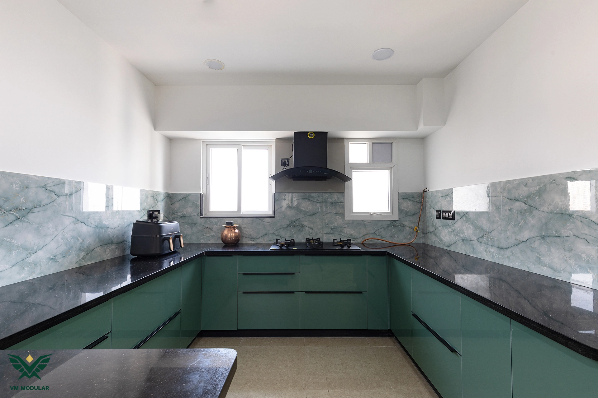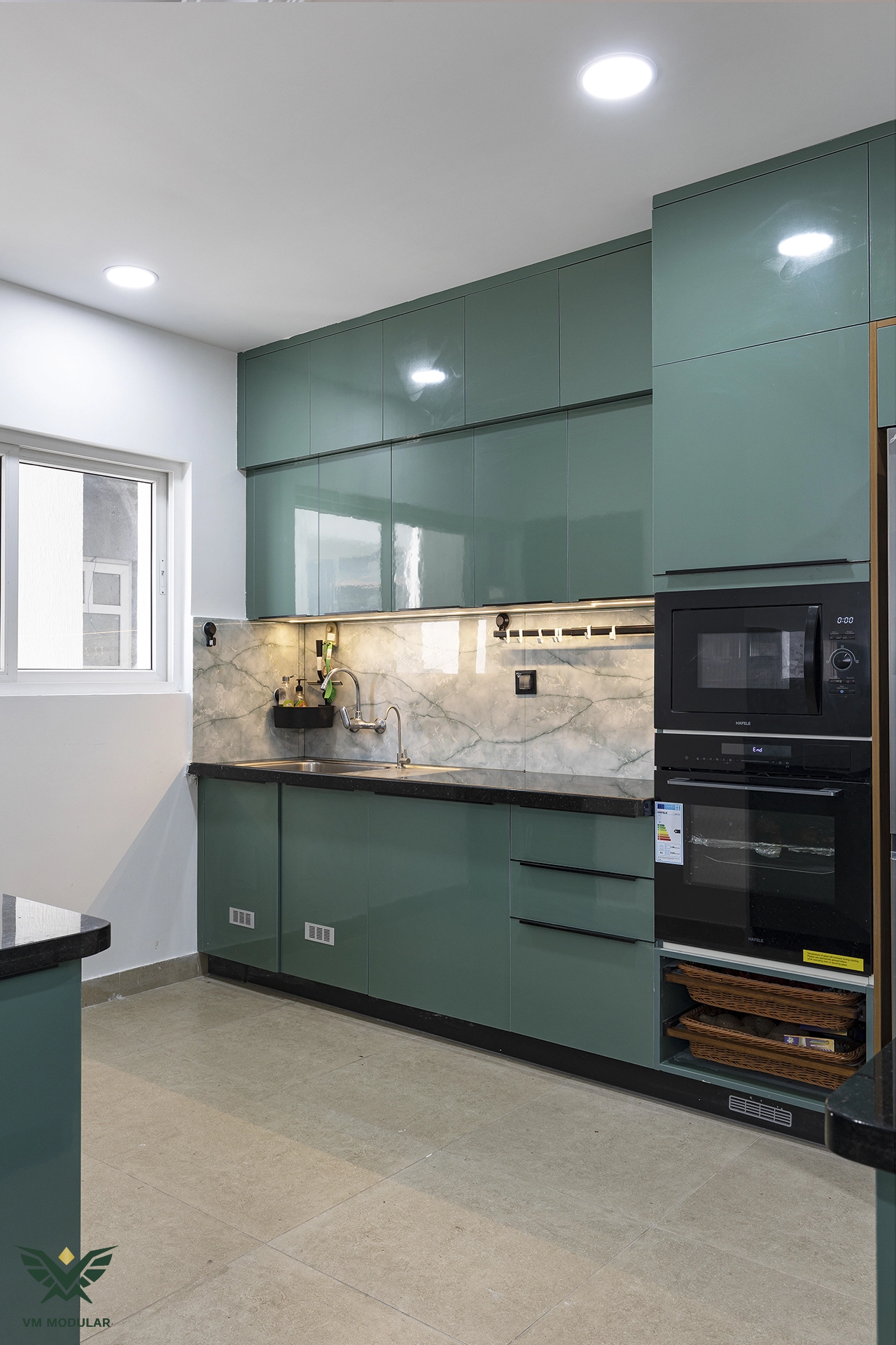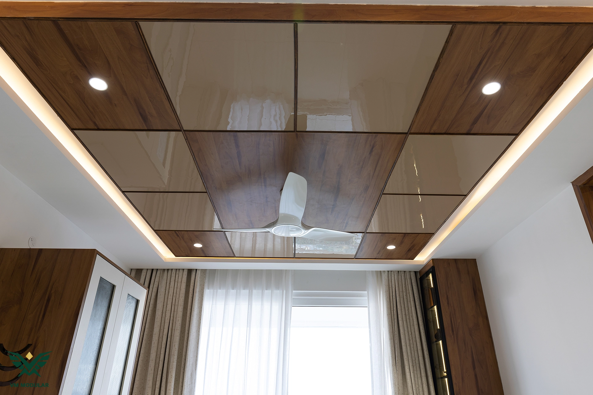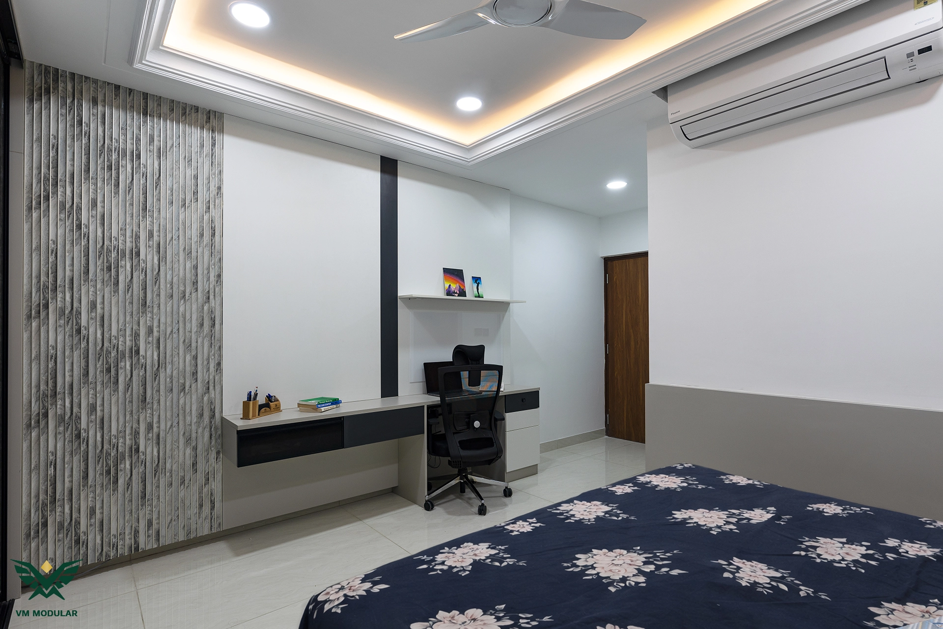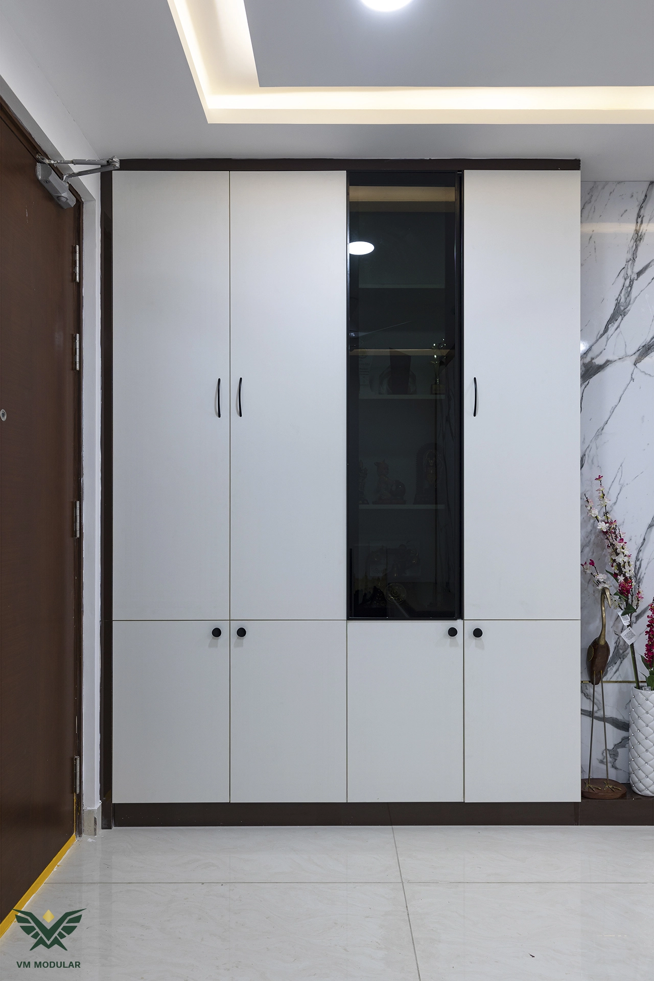 Located in the luxury corridor of Kokapet, this expansive 4BHK interior design project at Prestige Beverly Hills is a testament to how modern aesthetics can gracefully embrace tradition. The design narrative centers on a seamless fusion: while the home is distinctly modern, the living area serves as a cultural anchor, where we meticulously integrated the client’s heritage solid wood swing into the layout, creating a nostalgic yet cohesive focal point. Addressing the floor plan’s constraints, we also designed a custom Pooja unit within the living space and dedicated a special wall to honor the client's parents' photo, ensuring the home remains deeply rooted in personal sentiment. Moving into the private zones, the design shifts to ultra-modern sophistication. In three of the bedrooms, we installed stunning floor-to-ceiling wardrobes with sleek glass shutters, creating a sense of openness and luxury. The guest bedroom creates a warm contrast with premium laminate-finish hinged wardrobes. Beyond storage, VM Modular executed a complete furnishing solution, crafting custom beds with upholstered headboards, ergonomic study units, and dedicated book storage for every room. Each bedroom also features a thoughtfully designed dresser unit, ensuring maximum functionality. From the entertainment-ready TV unit in the living room to the heavy-duty modular kitchen, every module is powered by world-class Blum hardware, promising a lifetime of smooth operation. This project stands as a prime example of premium residential interiors in Hyderabad, where personalized design meets factory-precision engineering.